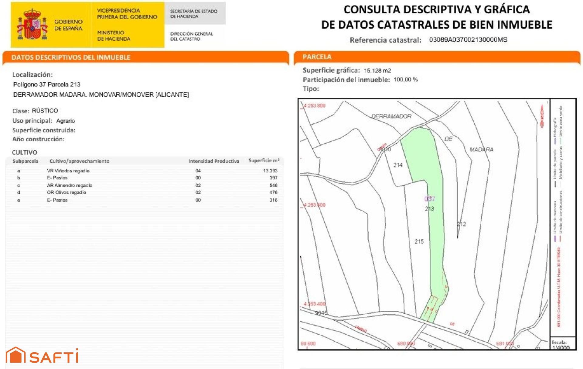 Se vende preciosa parcela rústica de 15406m2, ubicada en una zona tranquila y con encanto natural, a tan solo 5 minutos del centro de Monóvar (Alicante).